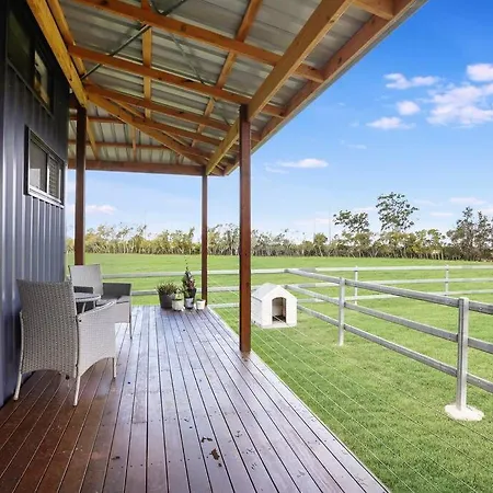 La Yamba Tiny House Iris Villa Palmers Island ofrece una terraza con vistas al río y se encuentra a 47 minutos en coche del aeropuerto regional de Clarence Valley.